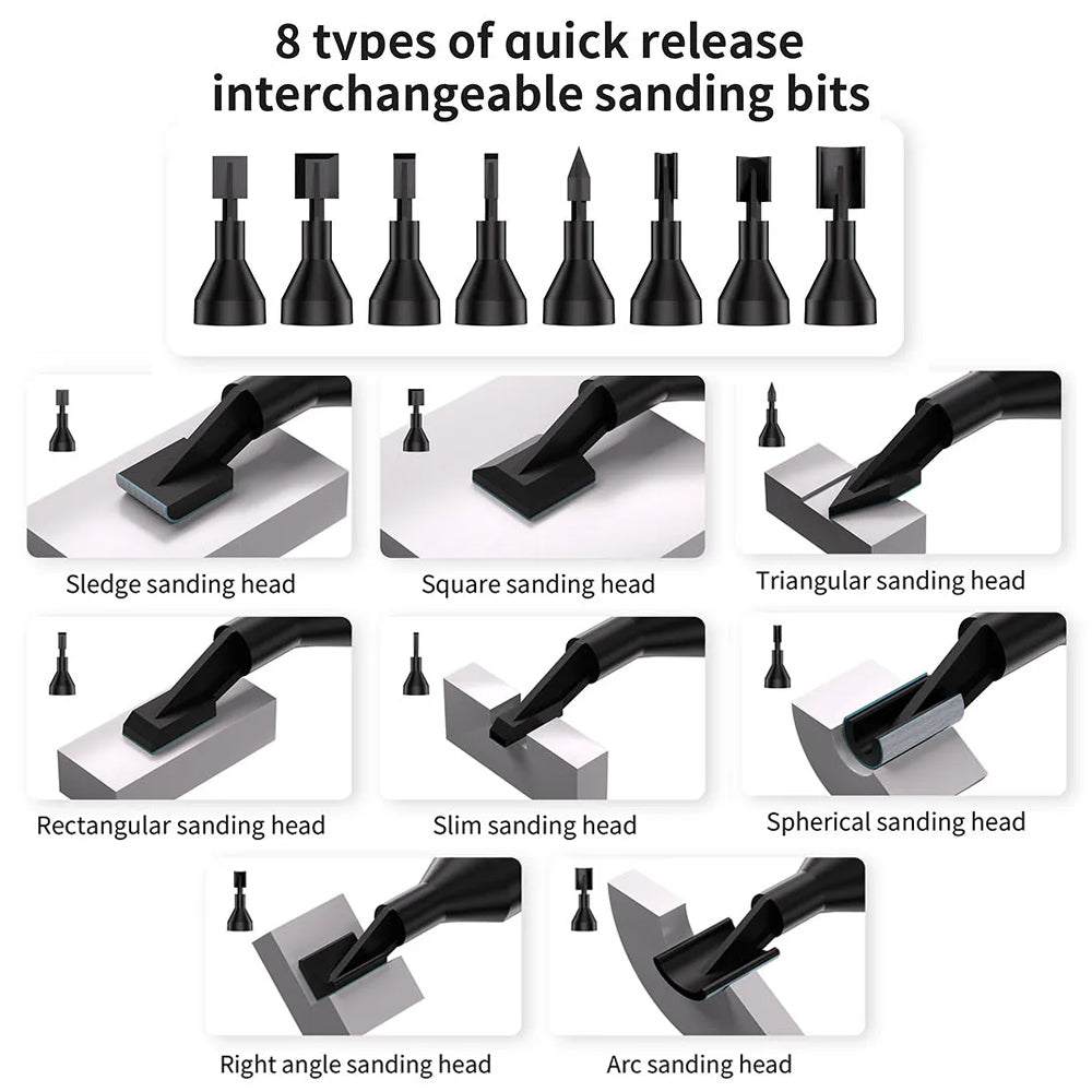 As you may or may not know, it is a reciprocating sander featuring several heads of different shapes. It allows you to sand parts you cannot easily do with rotary tools—and, of course, much more conveniently than with sanding sticks.