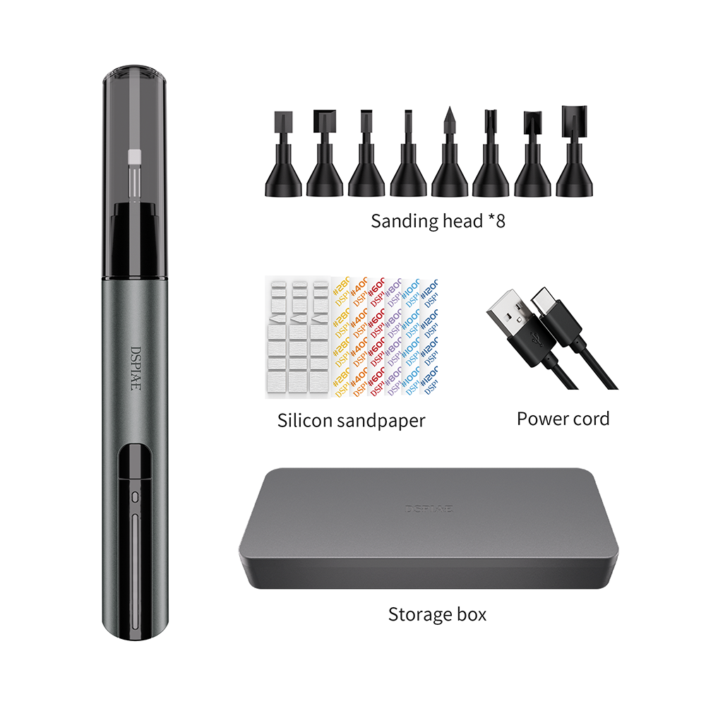 The base set includes the sander, charging cable, some heads, and sanding papers (see images for reference). Extra heads and sandpapers are also available.